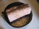 Un trancio di rigatino farcito di mela e albicocca candite, prugne, coccola di ginepro, un paio di cucchiai di marmellata di arance amare delle monachine, aglio, ramerino, sale. Arrotolare, legare e in forno a 180 gradi per circa quaranta minuti allegandoci poi un vino che sa di vino, un raspante sangiovese, non un budino di legno e vaniglia.