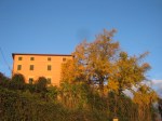 Una splendida pianta dalla chioma gialla in cima ad una collina con infiltrazioni di edera e palline come fossero di natale di pomi cachi maturi arancioni che insieme compongono un effetto scenico davvero notevole.