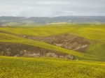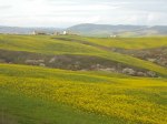 Pennellate docili, gialle, intense intinte di ondulazioni della campagna di Asciano, con il biancospino in fiore che si intromette nel tepore di una primavera che qui guardandola, pare musicata dal polline di Ennio Morricone.