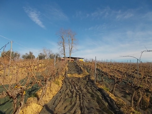 Il pomo e i teli da olive nella vigna