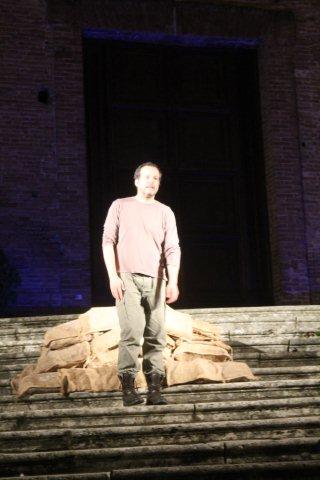 ← Mario Perrotta in “Milite Ignoto – Quindicidiciotto” sulla scalinata della chiesa dei Servi a Siena