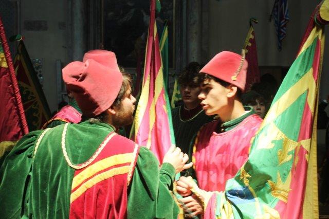 E’ un momento toccante, dove i cuori battono all’unisono e si uniformano alla cadenza dei tamburi, il cui suono non trova uscita dalle tegole che coprono la Basilica (se non nel transetto destro dove piove come fuori) e le bandiere degli alfieri nelle loro alzate quasi toccano le capriate.