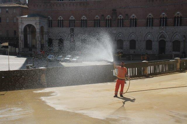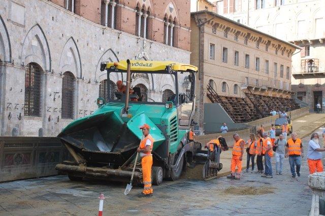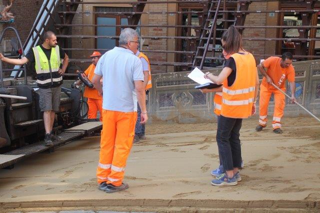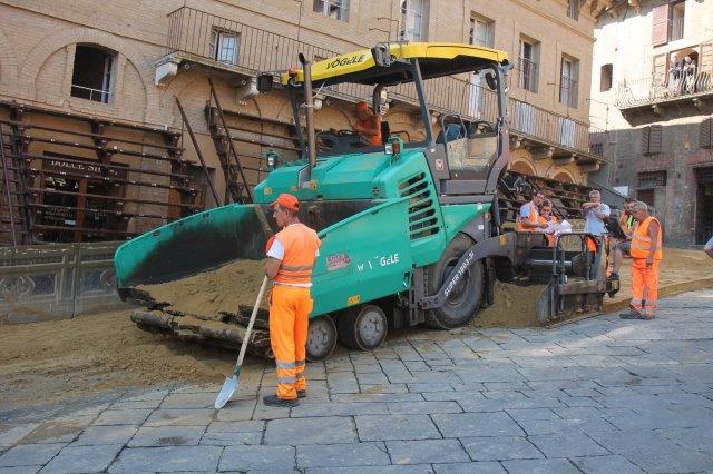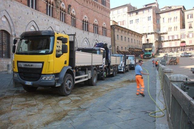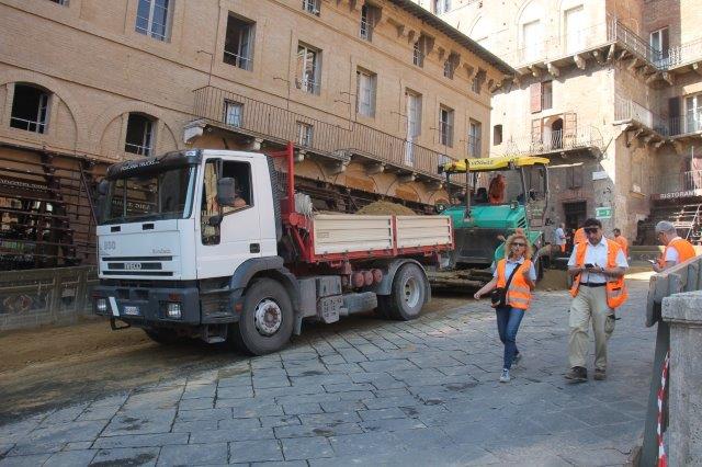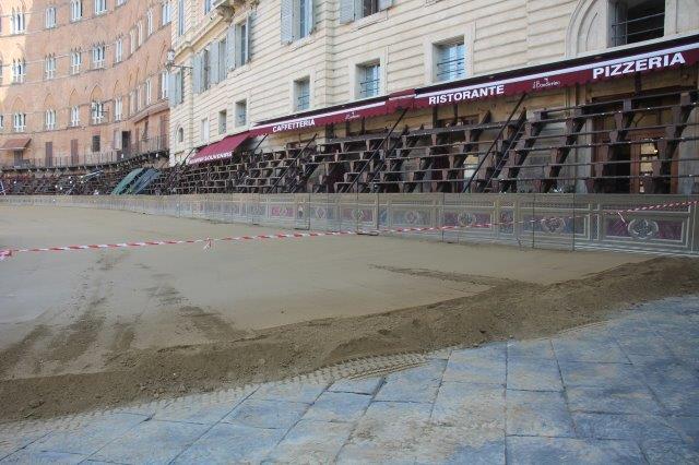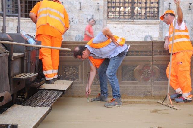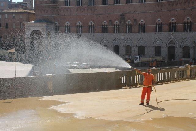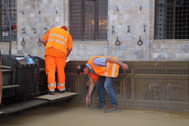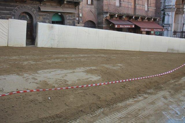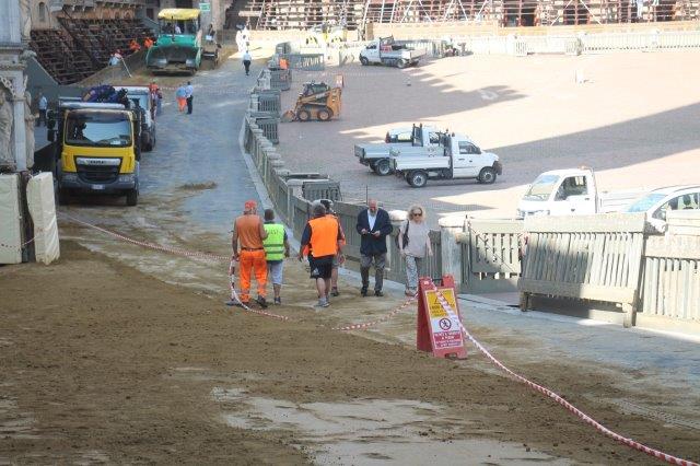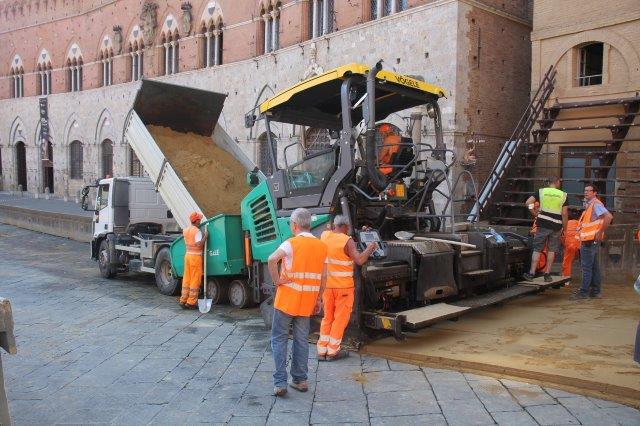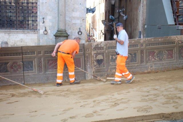 Di buon mattino, tonnellate di tufo sono state stese in Piazza del Campo e subito bagnate per farlo compattare in un garrire frenetico di migliaia di rondini di fronte a Palazzo Comunale.