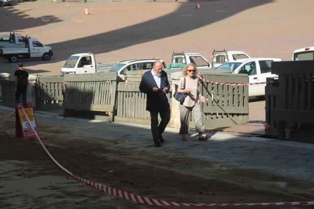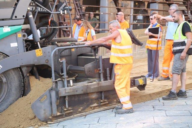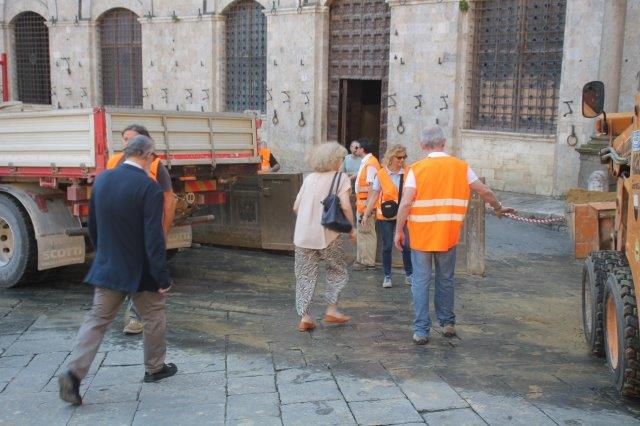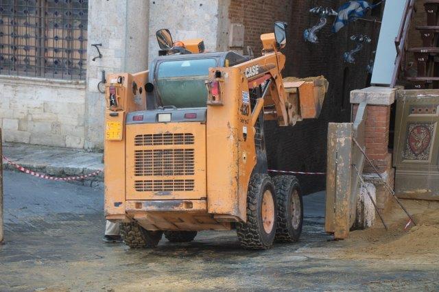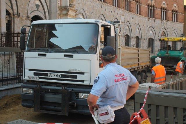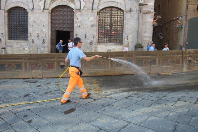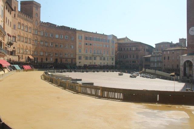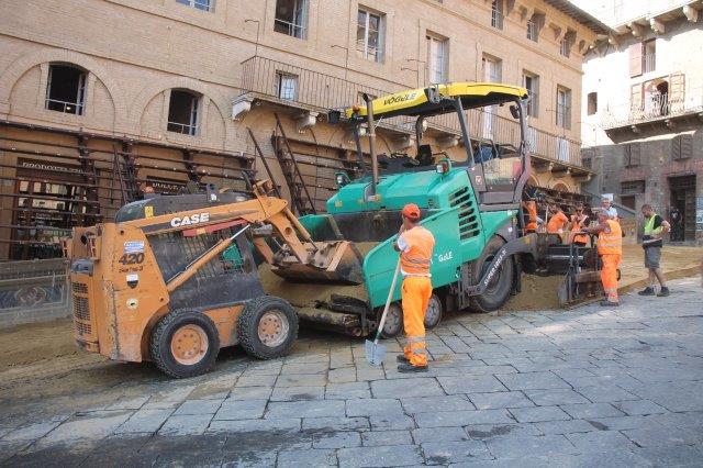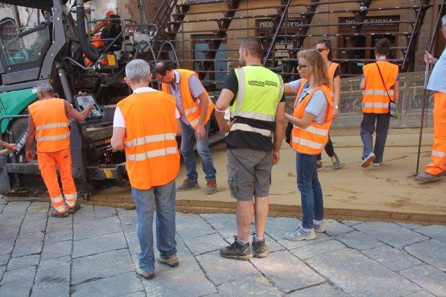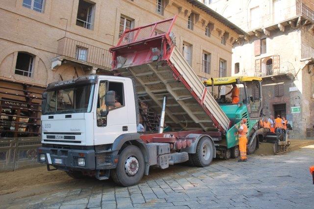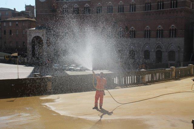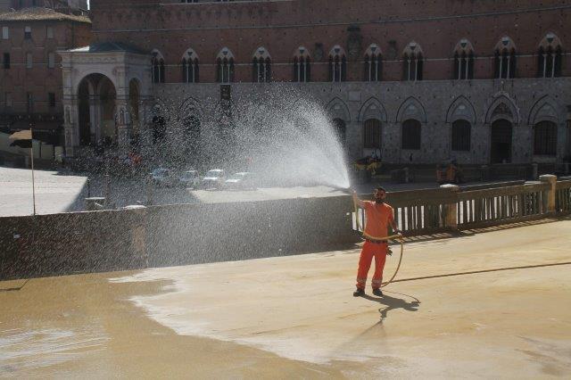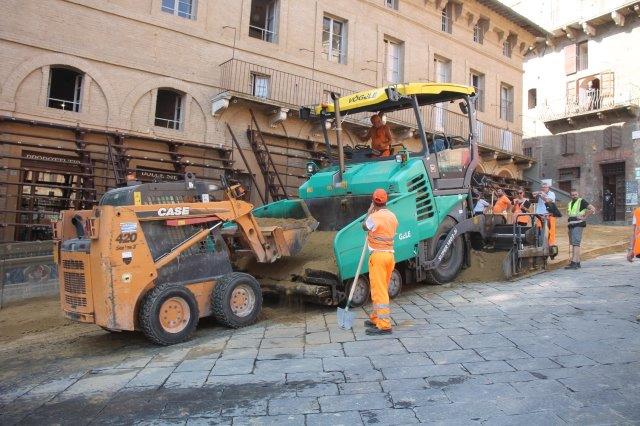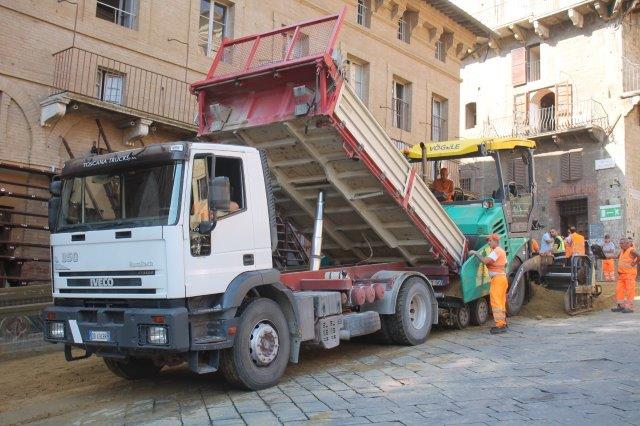 Di buon mattino, tonnellate di tufo sono state stese in Piazza del Campo e subito bagnate per farlo compattare in un garrire frenetico di migliaia di rondini di fronte a Palazzo Comunale.
