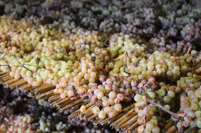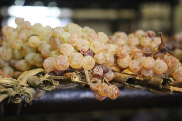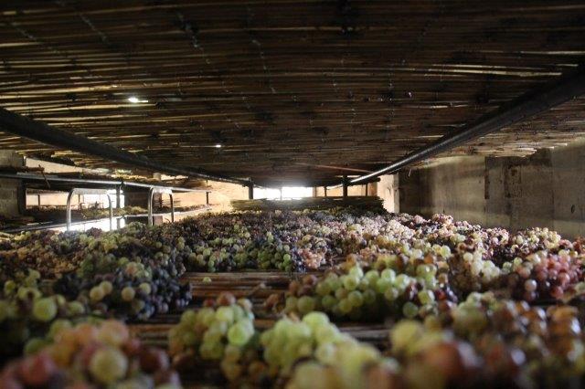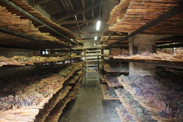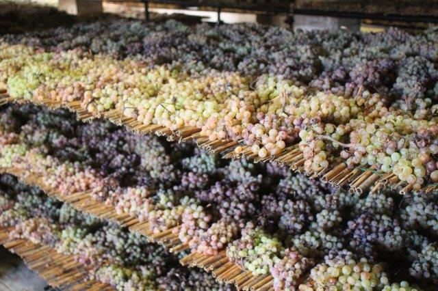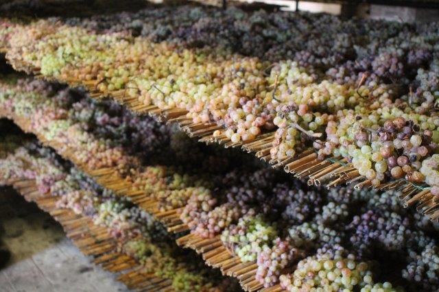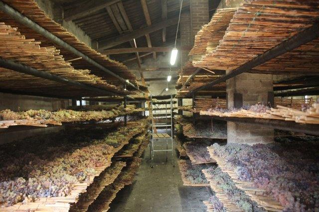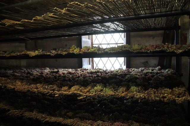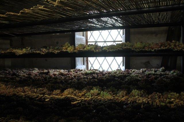 Il presente e il futuro del Vinsanto in una sola stanza, con decine di caratelli dai legni e dalle età diverse, con l’uva del presente posta ad asciugarsi prima di arrivare al punto zuccherino giusto per essere riscesa al piano di sotto, schiccolata grossolanamente e pressata, per separare quel liquido prezioso che sgorga dalle bucce dopo l’appassimento.