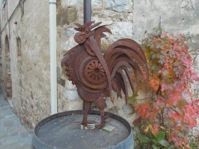 Il gallo canterino su barile a San Gusmè è un’opera geniale che ricalca quella corrente artistica che ha come un vino del territorio nel motore.