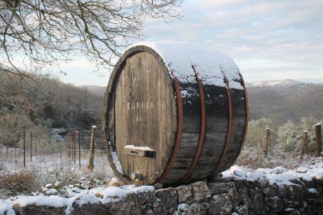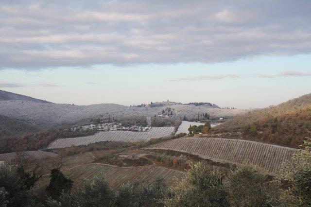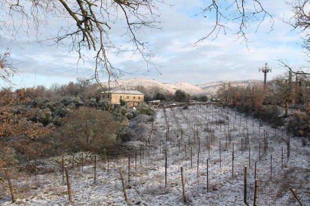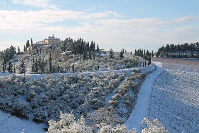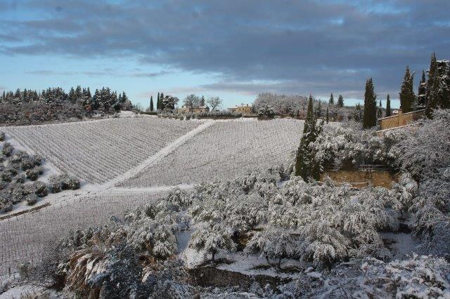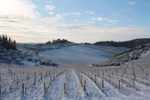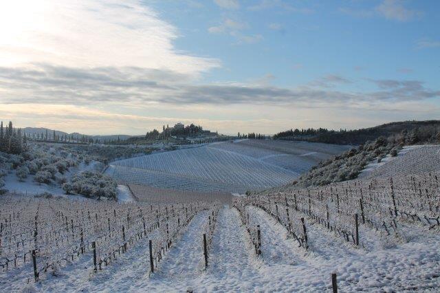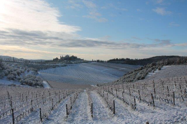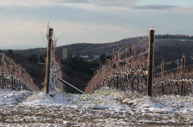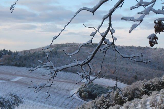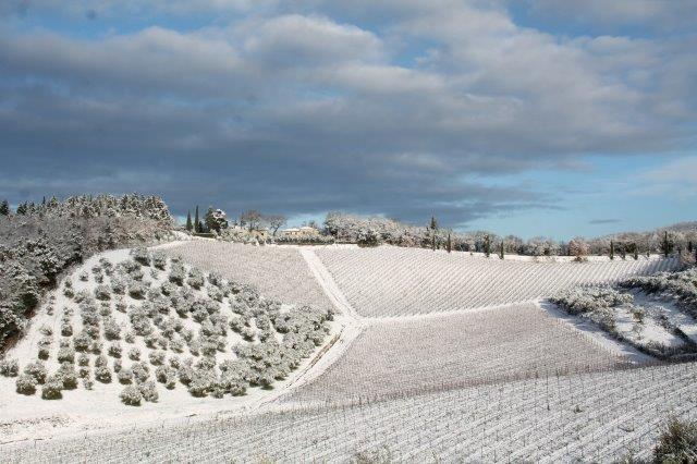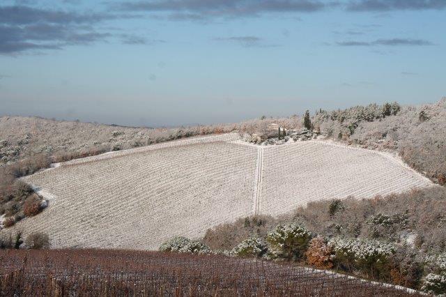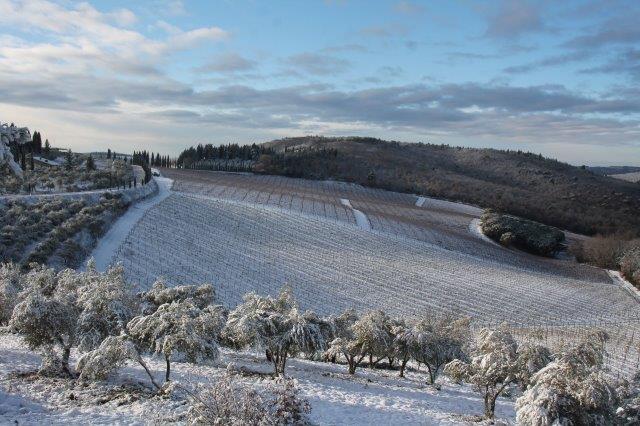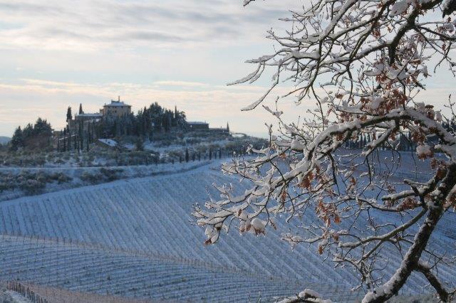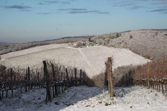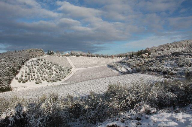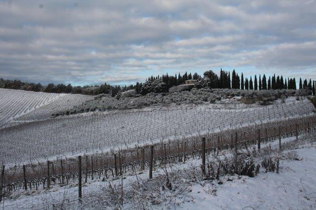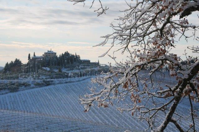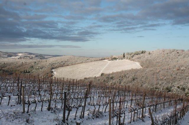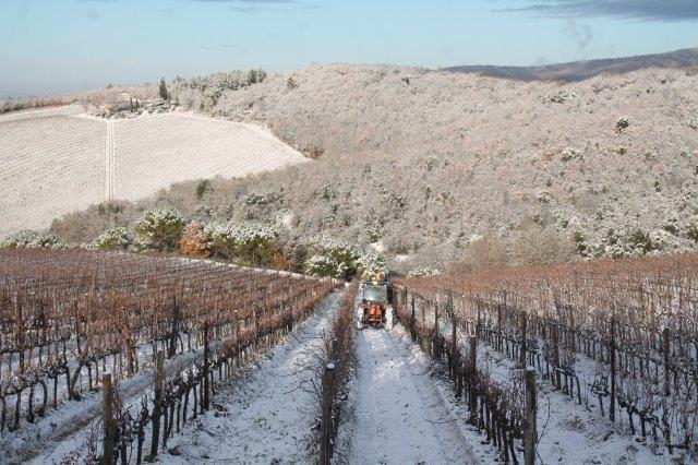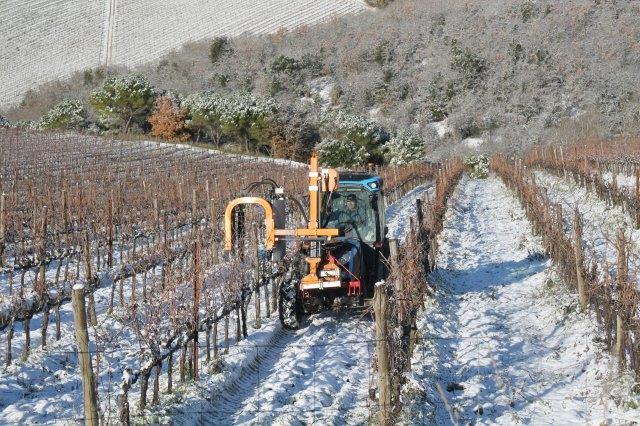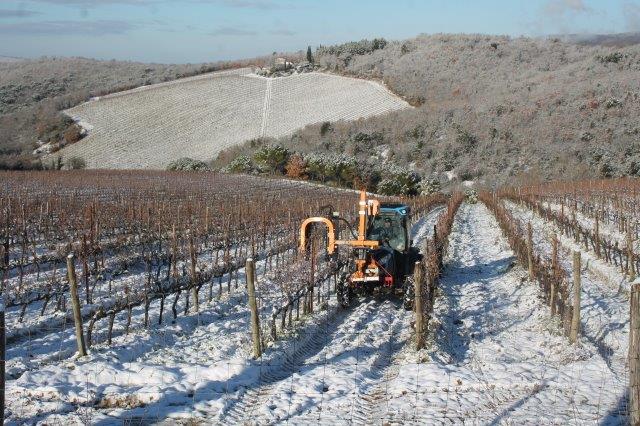Un grande silenzio rotto solo da un eroico sul trattore che trincia i tralci spogli delle viti affondando le suole di gomma nei filari interamente coperti di bianco.