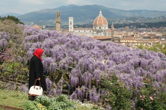 Il pergolato di glicine lungo settata metri di Villa Bardini a Firenze è nella fase di sbadiglio e risente delle condizioni climatiche attuali, ma niente gli impedirà di aprire i suoi grappoli violetti a partire dalla metà di questo mese, dando la possibilità alla città che lo ospita di una visita a qualcosa di naturale e bello.