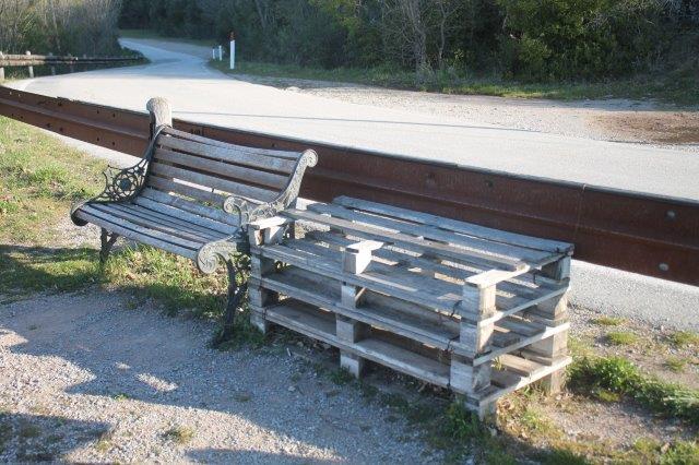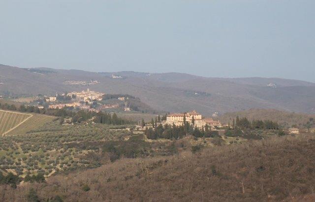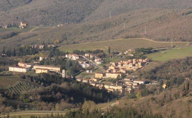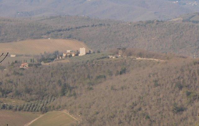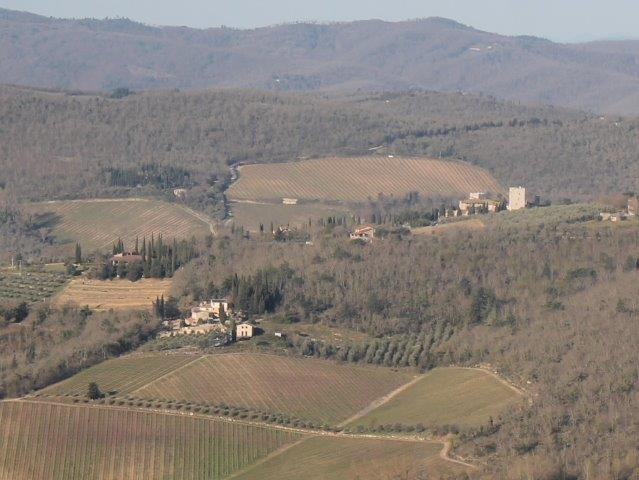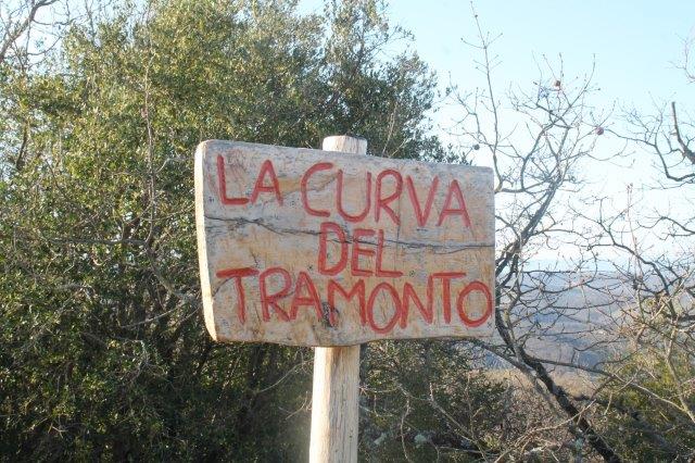 Una curva simmetrica con le macerie sempre più macerie della torre con una panchina ufficiale e una ricavata da una saggia gestione di pancali per un affaccio di Chianti che al tramonto offre una comoda seduta su una valle dalle cui colline scorre un gran vino.